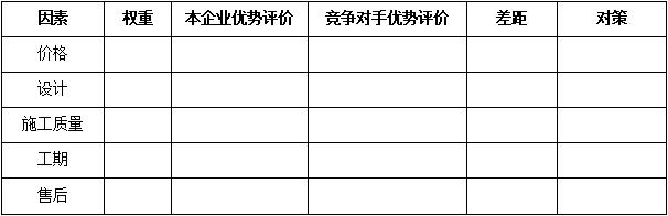 | 關(guān)鍵成交因素 | 資源投放重點(diǎn) | 本企業(yè)資源投放優(yōu)勢(shì)評(píng)分 | 競(jìng)爭(zhēng)對(duì)手資源投放優(yōu)勢(shì)評(píng)分 | 差距 | 對(duì)策 |